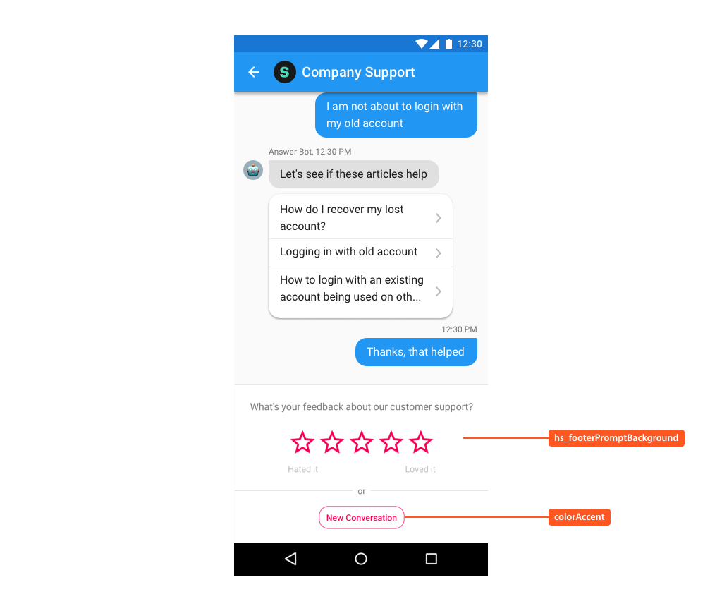 | hs__footerPromptBackground | Color of footer background in FAQ and Conversation screens. |