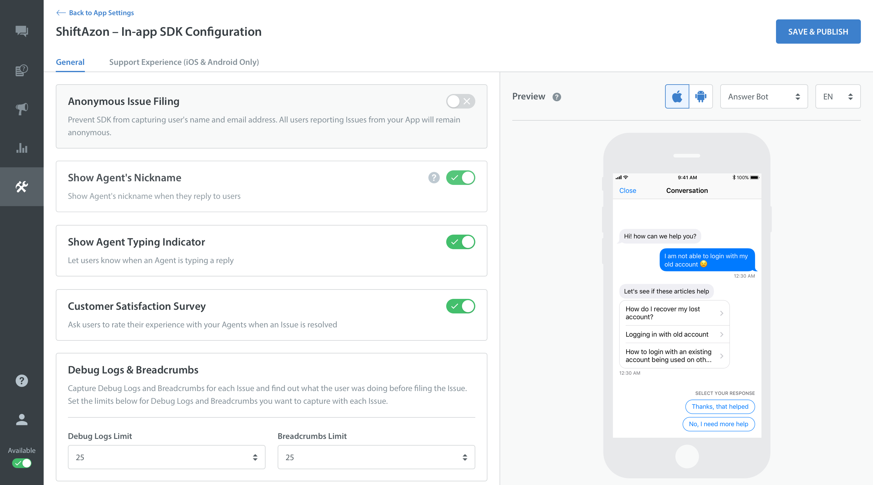 If you want to show the Resolution Question to your users when an issue is resolved, you can turn the feature Resolution Question, ON from the in-app configuration page on the Admin dashboard. Settings > App settings.