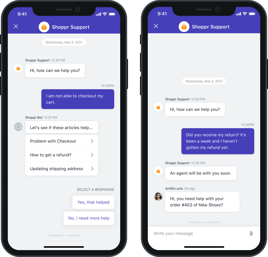This View Controller combines the FAQ, Search and Contact Us functionality together in a single interface. In this view, a user can search for a specific question in the FAQ failing which they can report an issue. When you respond back to their question from the Helpshift Agent Dashboard, the reply will be shown as a count besides Contact Us, clicking on which will open up the conversation.